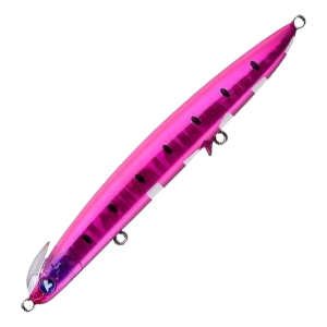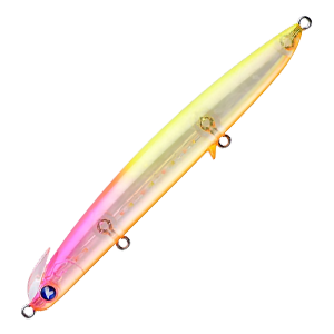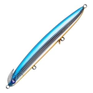 The BlueBlue Frid is a sinking pencil bait designed for surf fishing, featuring a rear-heavy balance for long casting and fast, controlled sinking. Its unique twin-lip structure produces a wide, metronome-like swing with strong vibrations that send clear feedback through the rod. The abdominal lip helps maintain a horizontal swimming posture, mimicking the silhouette of a metal jig to entice cautious fish. Easy to track on the drop and resistant to snagging, the Frid is ideal for targeting fish that are visible but difficult to hook.
