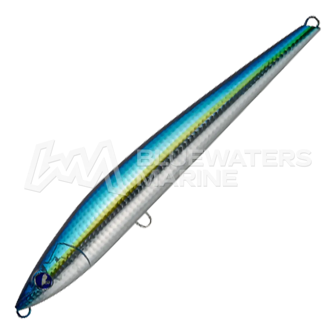 The BlueBlue Gachisla is a heavyweight sinking pencil designed for targeting large predators like giant trevally and bluefish. Its slim, rear-weighted body minimises air resistance for exceptional casting distance and a fast, controlled drop.Despite its slender profile, the lure delivers a strong wobble-and-roll action. A free-moving internal weight in the head creates an unpredictable S-curve on the dive, accompanied by a distinctive clatter that draws fish from a distance. Built with reliable through-wire construction, the Gachisla combines long-range performance with the strength needed for big-game encounters.