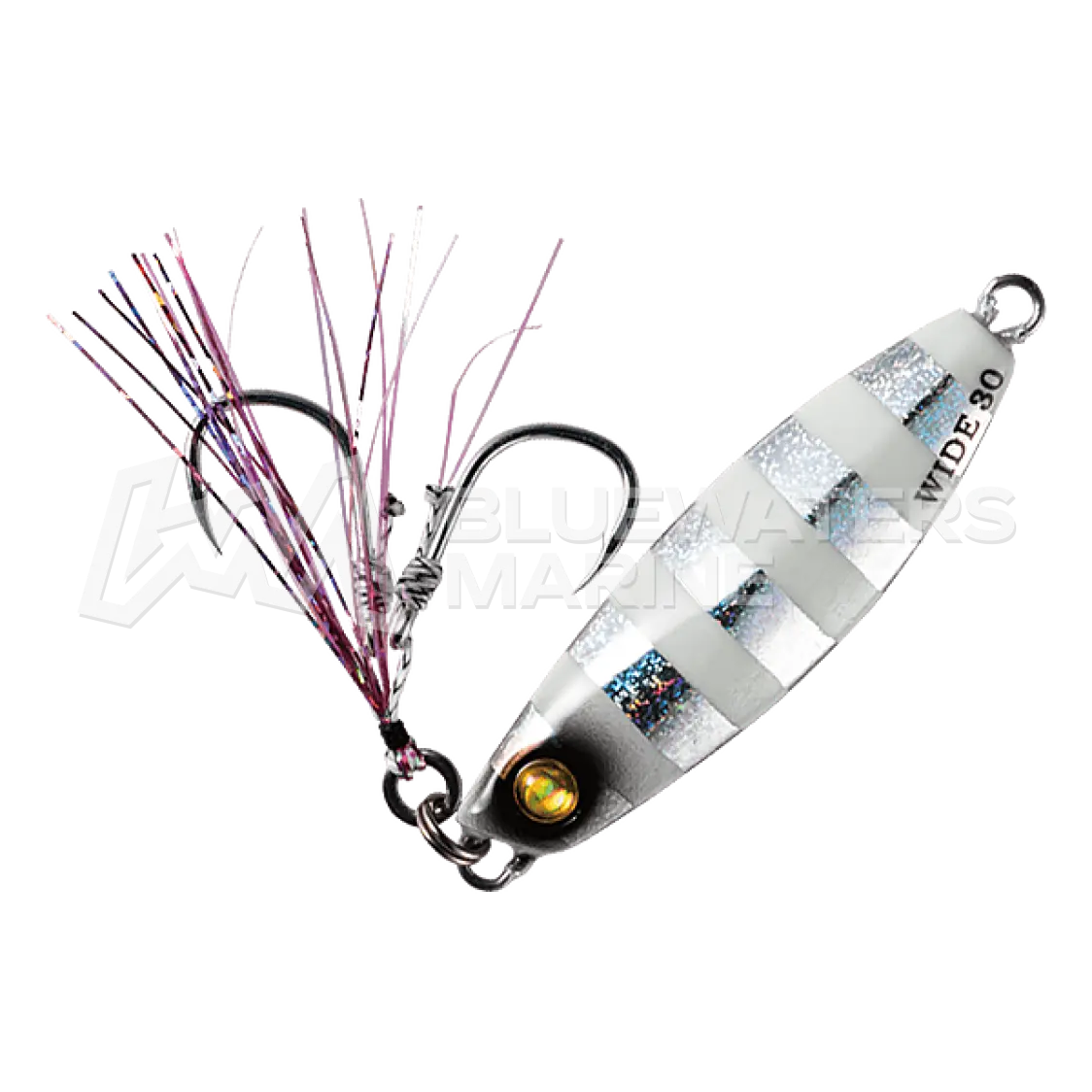The Hayabusa EX975 Jack Eye Shot Slow Wide is a slow-pitch jig built for versatility and performance in tough conditions. Its asymmetrical, centre-weighted body offers excellent castability and dynamic action, even with slow retrievals or on the fall. One glittered flat side and one conical side with shimmer tape create an erratic, light-reflecting flash to attract fish.A reinforced coating resists impact, while tin-coated hooks and a Sabiki-style assist line provide corrosion resistance and visibility. Designed for strong currents or surf, it excels with slow retrievals or gentle jerks, mimicking wounded baitfish. The double assist hooks reduce snags, making it ideal for shore and offshore jigging. It’s especially effective when fish are sluggish or near the bottom, targeting species like snapper, trevally, grouper, and seabream.