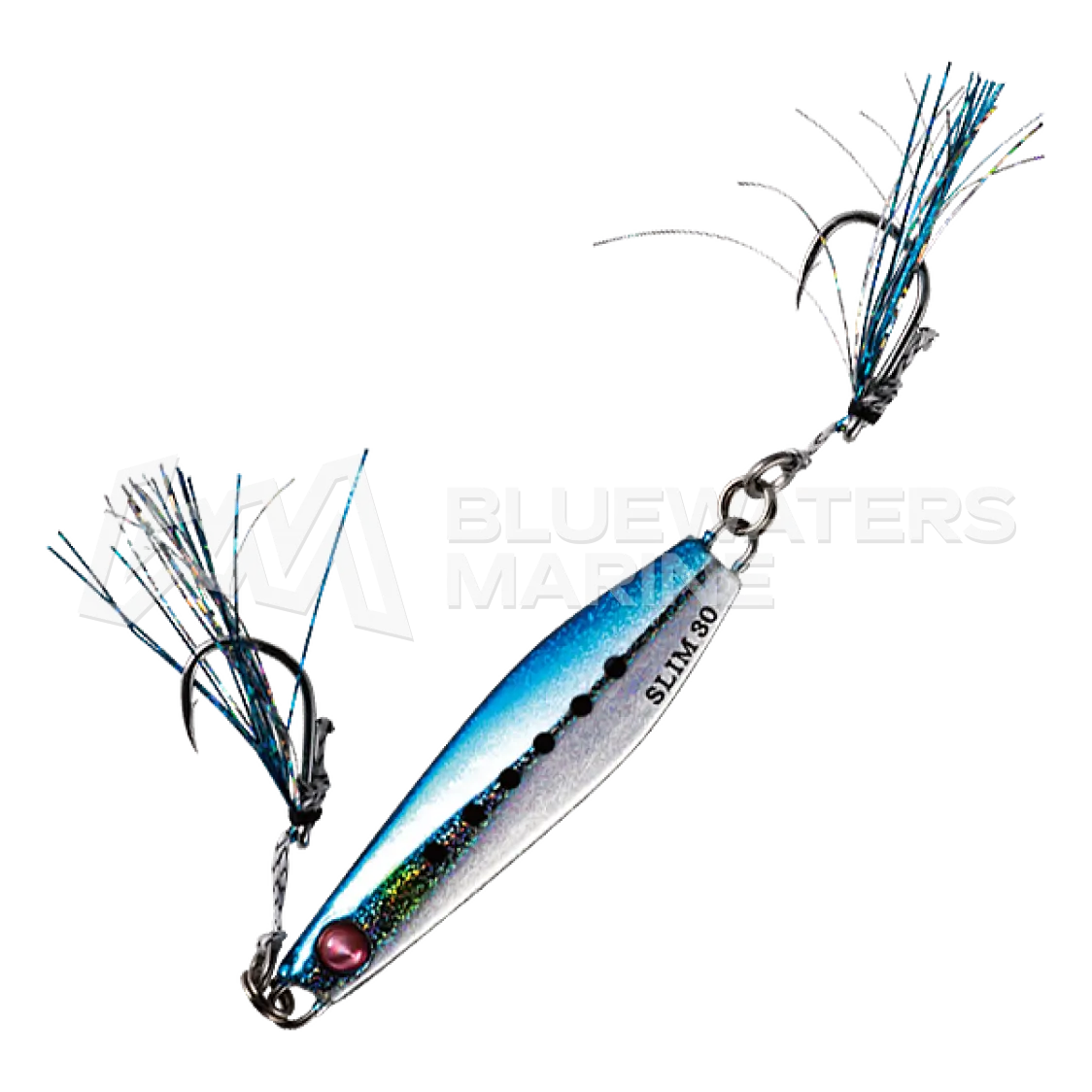 The Hayabusa EX976 Jack Eye Shot Slow Slim is built for long-distance casting thanks to its rear-weighted slim profile. This design produces a stable wobbling action, allowing anglers to cover a wide area efficiently. On a steady retrieve, the lure mimics realistic baitfish movement, enticing strikes even from hesitant predators. Double assist hooks increase hook-up rates, especially during second bites, while the asymmetrical holographic finish and sabiki-style assist hook add extra visual appeal. Equipped with anti-rust, tin-coated hooks and a durable body coating, this lure is made to withstand harsh saltwater environments and repeated strikes.
