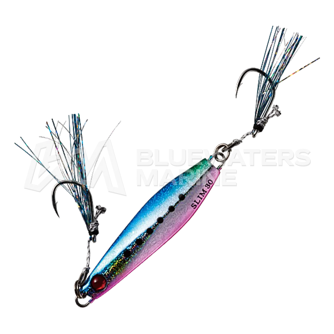 The Hayabusa EX976 Jack Eye Shot Slow Slim is built for long-distance casting thanks to its rear-weighted slim profile. This design produces a stable wobbling action, allowing anglers to cover a wide area efficiently. On a steady retrieve, the lure mimics realistic baitfish movement, enticing strikes even from hesitant predators. Double assist hooks increase hook-up rates, especially during second bites, while the asymmetrical holographic finish and sabiki-style assist hook add extra visual appeal. Equipped with anti-rust, tin-coated hooks and a durable body coating, this lure is made to withstand harsh saltwater environments and repeated strikes.