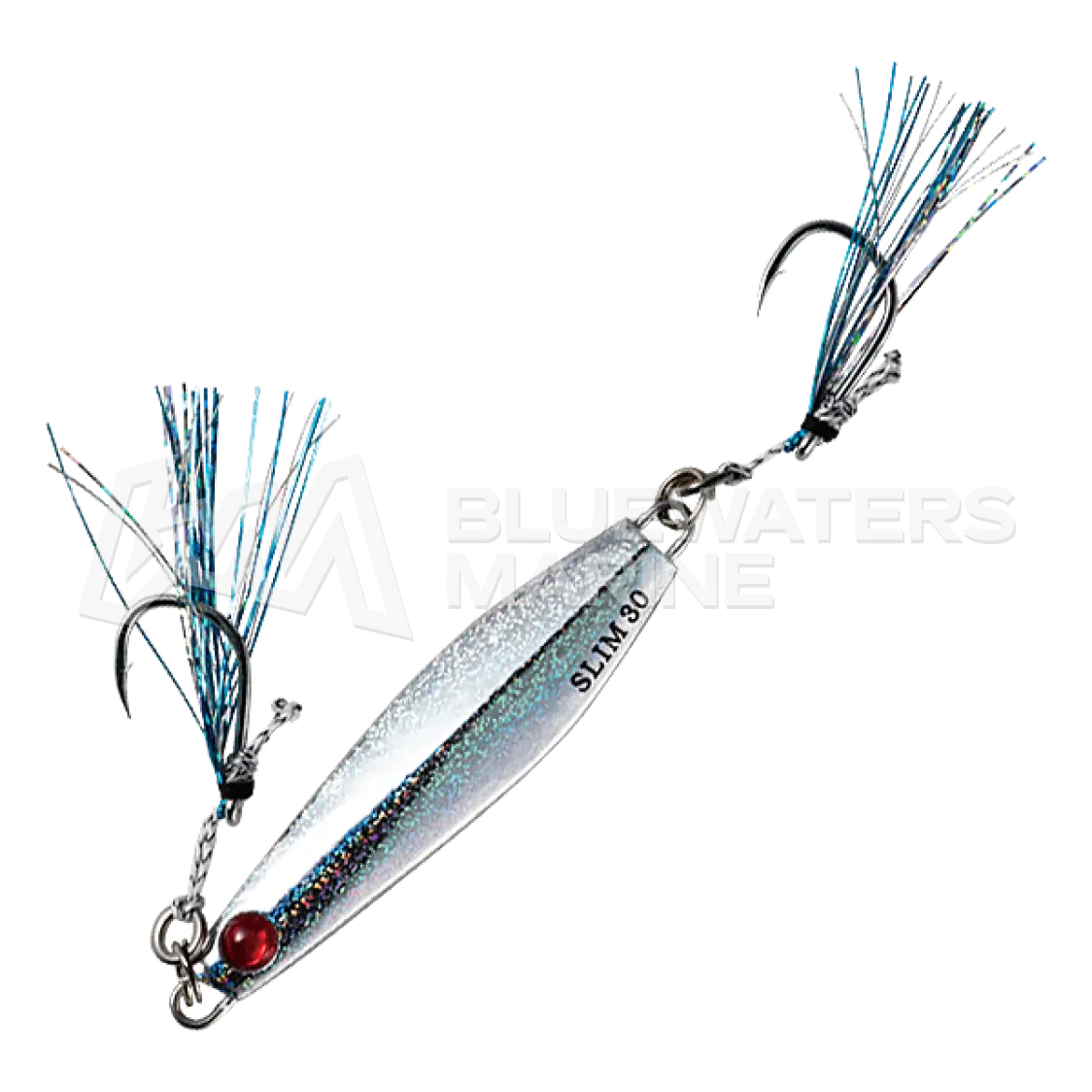 The Hayabusa EX976 Jack Eye Shot Slow Slim is built for long-distance casting thanks to its rear-weighted slim profile. This design produces a stable wobbling action, allowing anglers to cover a wide area efficiently. On a steady retrieve, the lure mimics realistic baitfish movement, enticing strikes even from hesitant predators. Double assist hooks increase hook-up rates, especially during second bites, while the asymmetrical holographic finish and sabiki-style assist hook add extra visual appeal. Equipped with anti-rust, tin-coated hooks and a durable body coating, this lure is made to withstand harsh saltwater environments and repeated strikes.