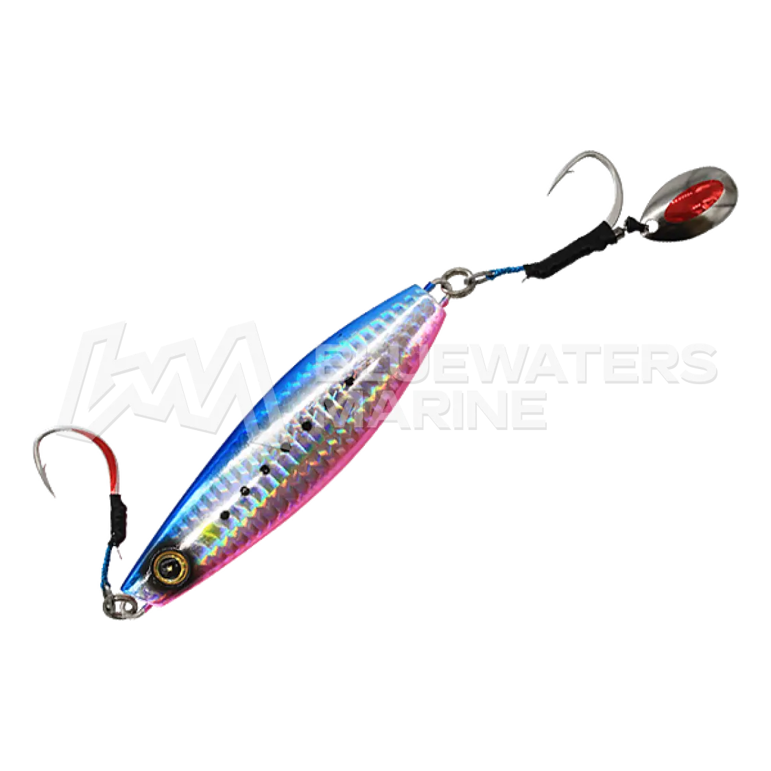 The Hayabusa FS401 Jack Eye Funemaki delivers a fresh and versatile presentation ideal for targeting species like yellowtail, amberjack, snapper, and grouper. Designed for vertical jigging, it excels when retrieved steadily toward the surface with intermittent pauses, triggering reaction strikes from fish across various depth ranges. Its lifelike side-to-side action, combined with vibration and flash produced by the rear holographic blade, makes it highly effective in drawing attention and provoking aggressive bites.