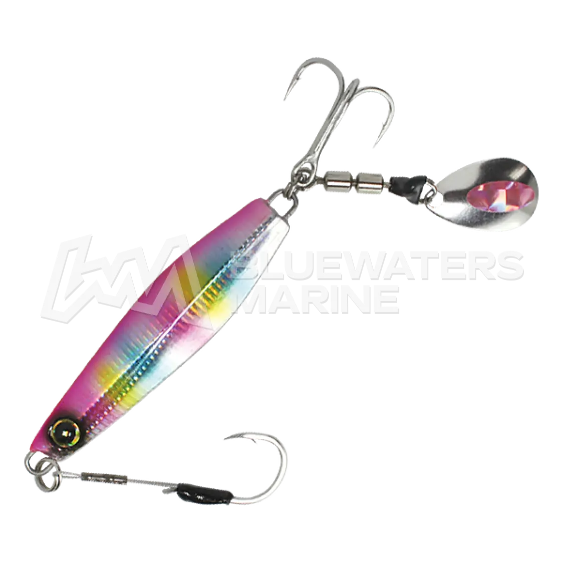 The Hayabusa FS438 Jack Eye MakiMaki Spanish Mackerel Special is a versatile light and slow jigging lure designed for safely targeting toothy fish like Spanish mackerel. It features a front steel assist hook, a carefully selected colour pattern, and a treble hook with a small spinner on a durable double swivel for added flash. Made with high-strength wire and quality materials, it handles larger fish with ease. This jig can be used in various ways: mid-water plugging, rhythmic bottom retrievals, or vertical jigging. For better action during vertical techniques, the treble hook can be removed to rely solely on the assist hook.